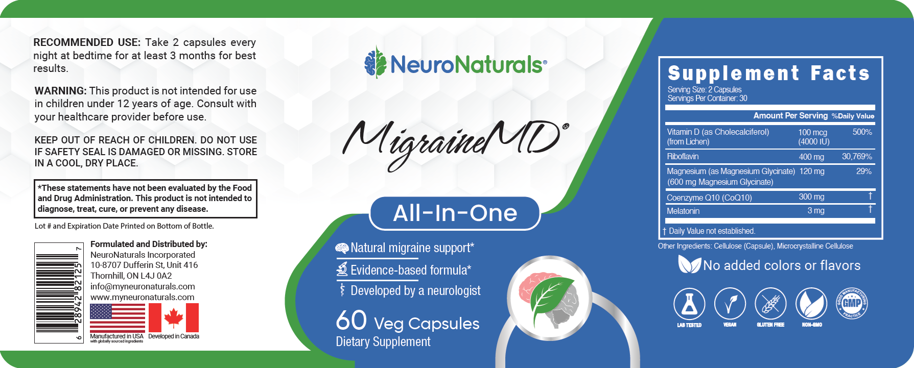 We believe in crafting pure products, minimizing unnecessary fillers and additives that do you no good. The only non-medicinal ingredient found in MigraineMD is microcrystalline cellulose, which is plant-based and simply aids absorption.